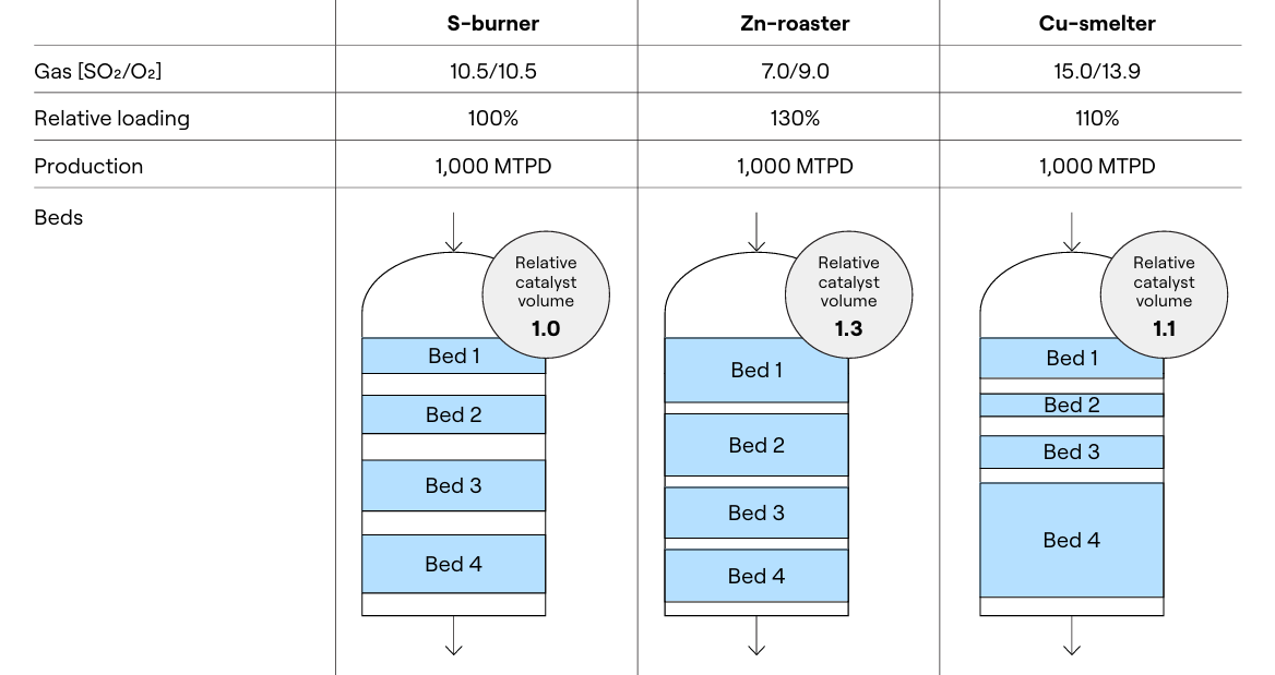 To meet new, very low, emissions limits, it is not sufficient to use general loading guidelines to design the catalyst loading. To be on the safe side, adding more or more advanced catalyst loadings will get the job done, but it is hardly very cost effective. If one, on the other hand, seeks to meet low emissions limits with the most cost-effective solution, detailed simulation models and know-how is necessary. Using the models and knowledge, tailor-made loadings for the specific plant and case can be prepared, meaning that the new limits can be achieved safely by installing a minimum amount of catalyst. To demonstrate how different loadings for different scenarios may be, please see a comparison between loadings for plants based on sulfur burning, zinc roasting and copper smelting off-gases in Table 1 below. As seen in Table 1, the loading size and catalyst distribution is very different in the different scenarios. Needless to say, general guidelines will do a poor job of capturing this difference, resulting in either too big or too small catalyst loading.